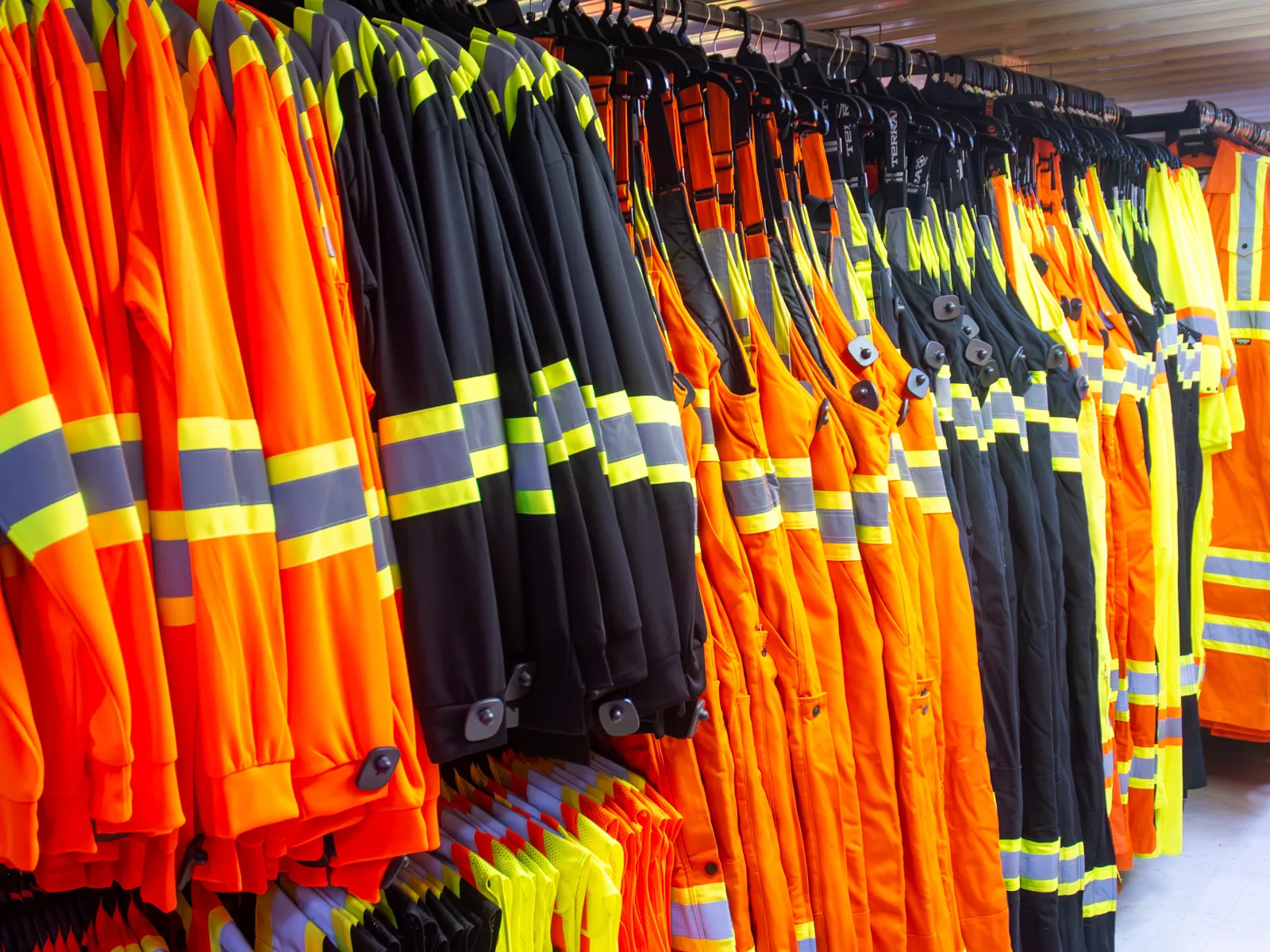 Hi-vis clothing, hard hats, respirators, face shields, hearing protection, and safety signage for farm and jobsite safety.